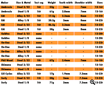 Here then is our first chart of sprockets. Measurements are firsthand, not supplied by manufacturers. Note that not all of the makes referenced here are available worldwide: some cogs aren't exported. But the chart should provide at least a basic guide to what's on the menu.